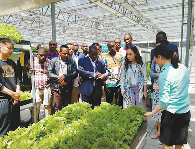 農(nóng)科院國家農(nóng)業(yè)科技創(chuàng)新園負(fù)責(zé)人給非洲青年科技人員講解蔬菜無土栽培技術(shù)