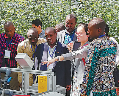 非洲青年科技人員饒有興致地了解無土栽培智能營養(yǎng)液循環(huán)控制系統(tǒng)。