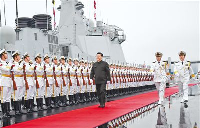 4月23日,在中國(guó)人民解放軍海軍70華誕之際,中共中央總書記、國(guó)家主席、中央軍委主席習(xí)近平出席在青島舉行的慶祝人民海軍成立70周年海上閱兵活動(dòng)。圖為習(xí)近平檢閱艦艇編隊(duì)。