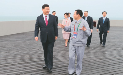 二○一八年十月二十三日上午,港珠澳大橋開通儀式在廣東省珠海市舉行。中共中央總書記、國家主席、中央軍委主席習(xí)近平出席儀式,宣布大橋正式開通并巡覽大橋。圖為習(xí)近平在港珠澳大橋東人工島察看大橋全貌。
