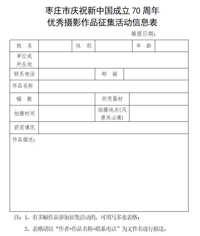附:棗莊市慶祝新中國成立70周年優秀攝影作品征集活動信息表