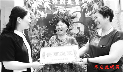 近年來,滕州市荊河街道積極引領轄區婦女參與建設“庭院美、居室美、家風美、文化美”的“美麗庭院”,全面助力鄉村振興建設。圖為:6月18日,該街道為榮獲“棗莊市美麗庭院”的王樓居譚艷華家庭頒授獎牌。