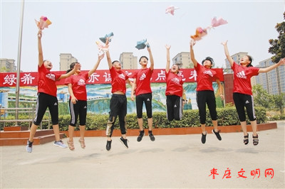 圖為:學生們歡呼跳躍,慶祝畢業(yè)。