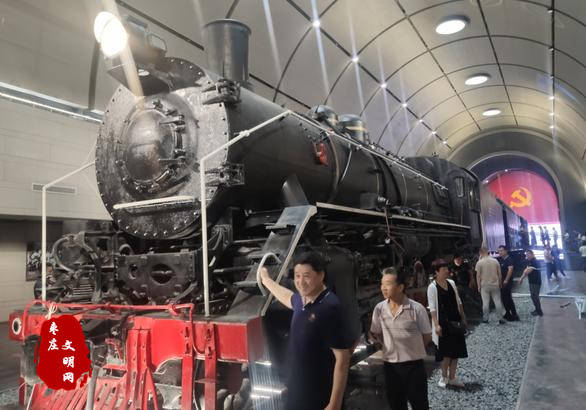 進入紀念館,首先是氣勢恢宏的序廳,一塊巨屏播放著電影《鐵道游擊隊》,兩側有大型浮雕,左側浮雕為中興煤礦公司發展的艱辛歷程,也是鐵道游擊隊誕生與發展的歷史背景;右側浮雕以鐵道游擊隊扒火車、打洋行、截軍列、百里護送等主要內容。往前走,是火車主題大廳,陳列著一輛民國時期的火車。長達54米的老式蒸汽機火車,鋪滿了碎石的鐵軌,陳舊的枕木,讓人們仿佛穿越到抗戰時期的鐵道線上。