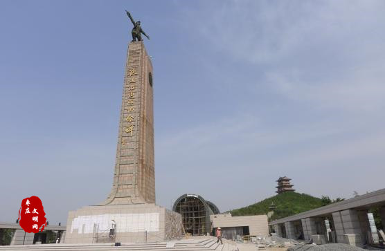 記者駐足這座火車頭造型的紀念館前,放眼東西,分別與雄偉壯觀的臨山閣、巍巍聳立的紀念碑、莊嚴肅穆的將軍碑廊、盤旋曲折的紀念甬道、平坦寬闊的紀念廣場穿珠成線;南北展目,分別與人民英雄紀念園、三雄墓、影視城守中成軸,近銜青山、遠眺微湖,與周邊自然人文建筑渾然一體,東倚高鐵、北望新城,英雄氣概浩然于胸。