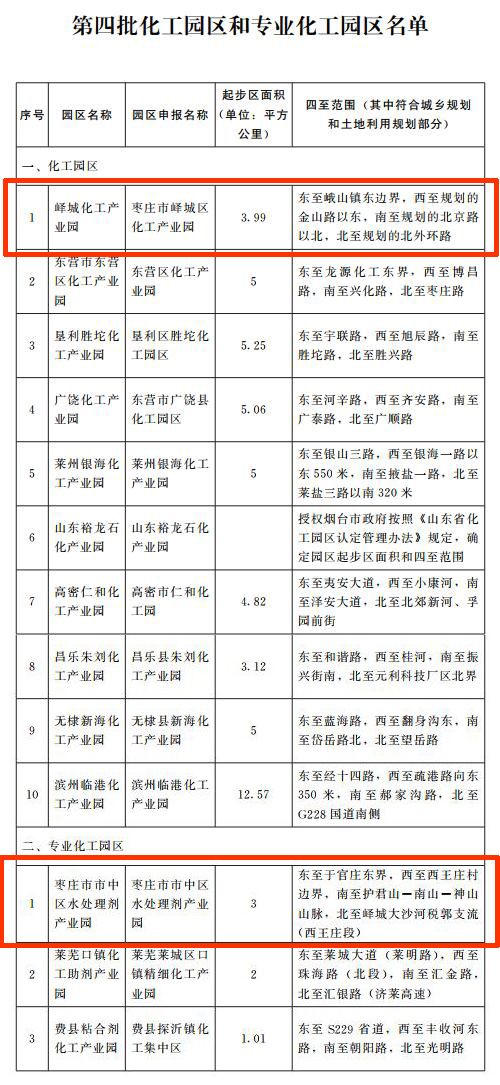 據(jù)了解,棗莊市嶧城區(qū)化工產(chǎn)業(yè)園面積為3.99平方公里,四至范圍:東至峨山鎮(zhèn)東邊界,西至規(guī)劃的金山路以東,南至規(guī)劃的北京路以北,北至規(guī)劃的北外環(huán)路。棗莊市市中區(qū)水處理劑產(chǎn)業(yè)園面積為3平方公里,四至范圍:東至于官莊東界,西至西王莊村邊界,南至護君山-南山-神山山脈,北至嶧城大沙河稅郭支流(西王莊段)
