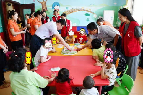 隨后,參加志愿醫療隊的成員和福利院的孩子們一起切蛋糕,將祝福和甜甜的蛋糕一起端到孩子們的手上。