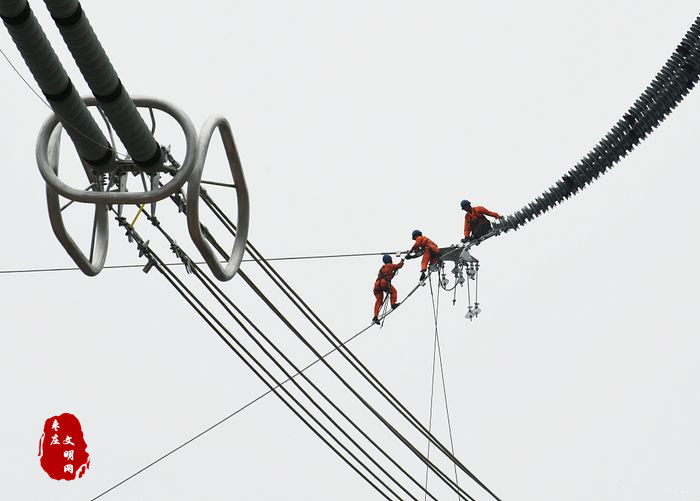1000千伏特高壓交流輸變電工程建設現場,施工人員在距地面100多米的導線上作業,猶如“空中舞者”。