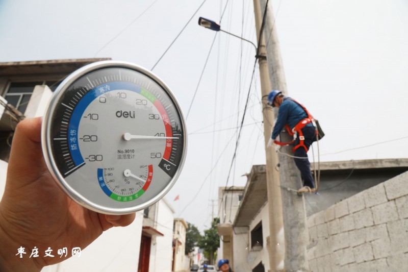 7月23日,正值大暑節氣,棗莊市市中南園村路上行人稀疏,42攝氏度高溫下,棗莊供電公司齊村供電所崔德平、吳艷超正在處理現低壓線路T接點接觸不實的隱患。