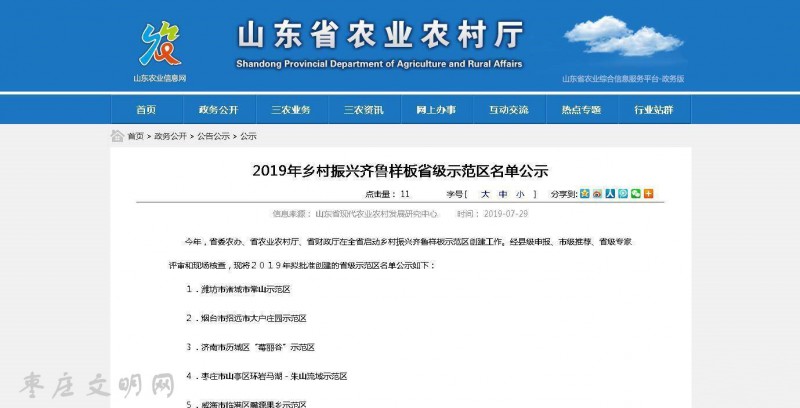 7月29日,山東省農業農村廳公示了2019年鄉村振興齊魯樣板省級示范區名單。其中棗莊市山亭區環巖馬湖-朱山流域示范區、棗莊市臺兒莊區邳莊示范區入選在冊。