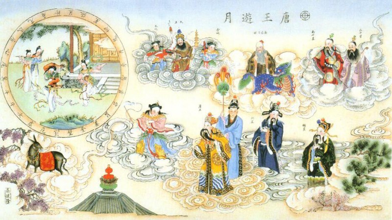 相傳唐玄宗與申天師及道士鴻都中秋望月,突然玄宗興起游月宮之念,于是天師作法,三人一起步上青云,漫游月宮。但宮前有守衛森嚴,無法進入,只能在外俯瞰長安皇城。在此之際,忽聞仙聲陣陣,唐玄宗素來熟通音律,于是默記心中。這正是“此曲只應天上有,人間能得幾回聞!”日后玄宗回憶月宮仙娥的音樂歌聲,自己譜曲編舞,創作了歷史上有名的“霓裳羽衣曲”。