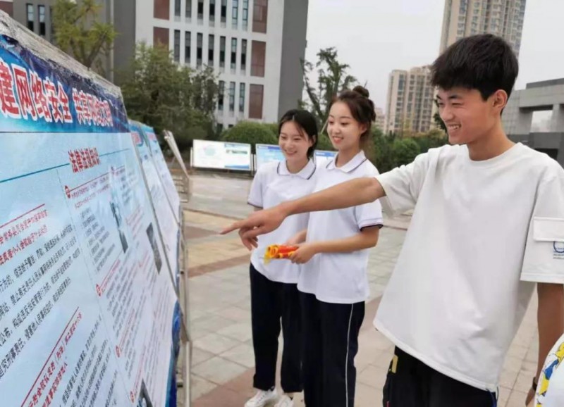 圖為在校學生正在觀看“共建網絡安全、共享網絡文明”展板。