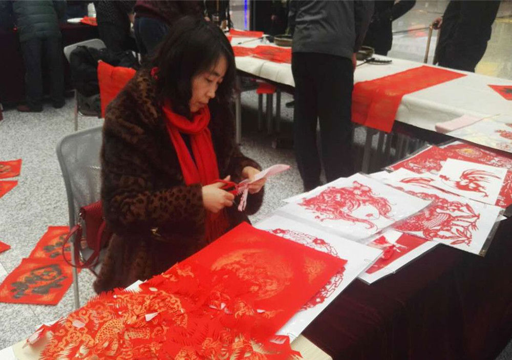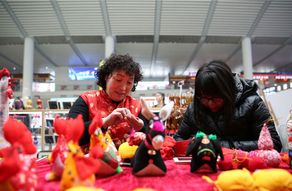 1月13日是春運第一天,記者在濟南西站看到,山東民俗文化已經進入了濟南西站的候車大廳,上百件山東非遺民俗手工藝品在車站二樓候車大廳內展出。國家級非物質文化遺產省級傳承人、山東剪紙技藝大師欒淑娟現場為旅客們剪出多式多樣的剪紙作品,免費贈送給旅客們收藏。