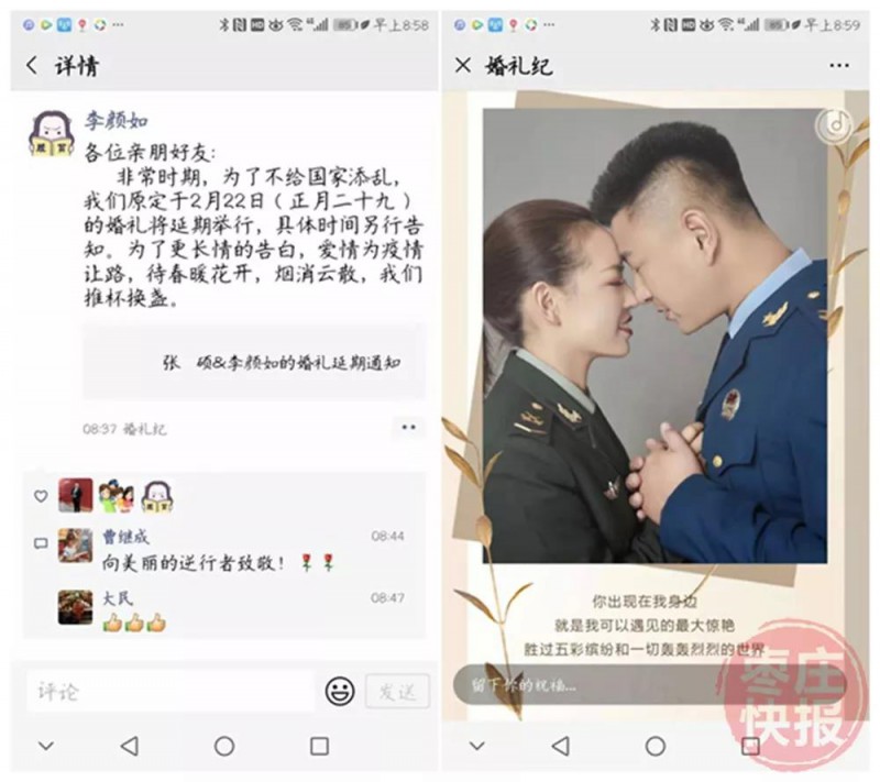 “隔離病毒,但愛(ài)不隔離,延期婚禮,但愛(ài)不延期,祝大家健康,讓我們同舟共濟(jì)、共克時(shí)艱。”正月十七一早,李顏如把婚禮延期的消息發(fā)布在了朋友圈。李顏如說(shuō):“特殊時(shí)期,個(gè)人幸福要讓位于群眾的生命健康。眾人拾柴火焰高,在這種關(guān)鍵時(shí)刻,我一定要和同事們站在一起,共渡難關(guān)。”