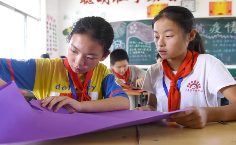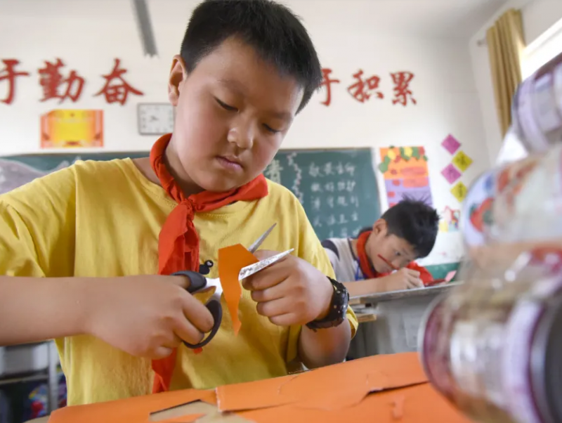 6月4日,水泉鎮華泉小學學生在利用廢棄物品制作“藝術品”。