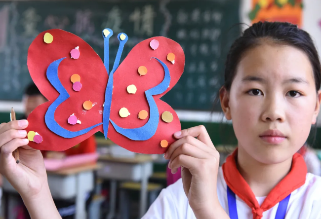 6月4日,水泉鎮華泉小學學生王燦在展示用廢紙制作的“蝴蝶”。