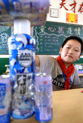 6月4日,水泉鎮華泉小學學生王慶旺在展示用易拉罐制作的“航天器”。