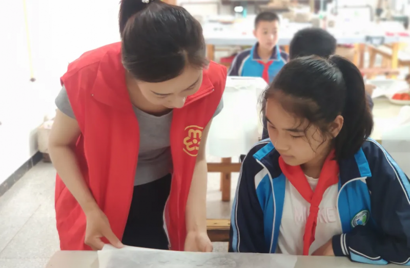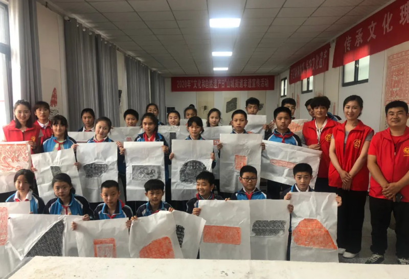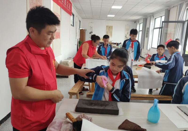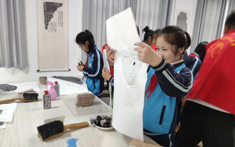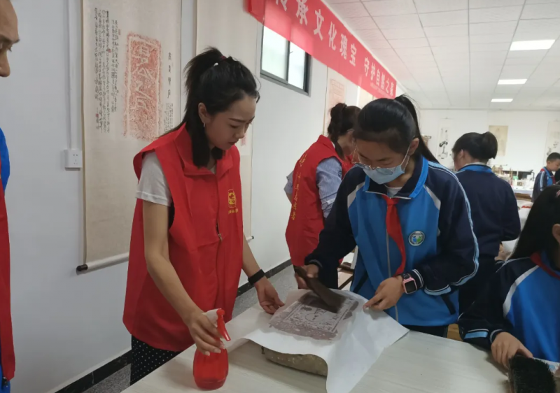 為迎接6月13日全國文化和自然遺產日,弘揚、推廣中國傳統非物質文化遺產項目,6月12日,山城街道新時代文明實踐站、文化站、團委、婦聯的志愿者帶領棗莊市第三十二中學30余名中小學生,到明佑博物館參觀并體驗非物質文化遺產項目—拓片的古法制作工藝。