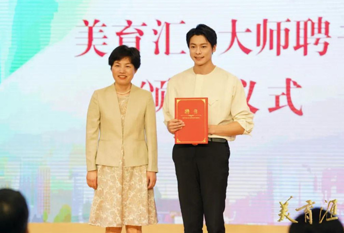 徐匯區(qū)教育工作黨委書記姚黎紅為王佳俊頒發(fā)美育匯名師聘書。