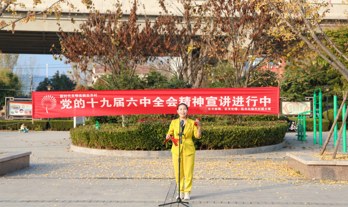 基層力量深入講,文藝隊伍生動講,11月19日,市中區齊村鎮新時代文明實踐廣場開展了學習貫徹黨的十九屆六中全會精神宣講活動。活動中,充分發揮本土文化能人作用,用老百姓能聽得進、記得住的鄉村語言,讓村民真正聽得懂、記得牢。