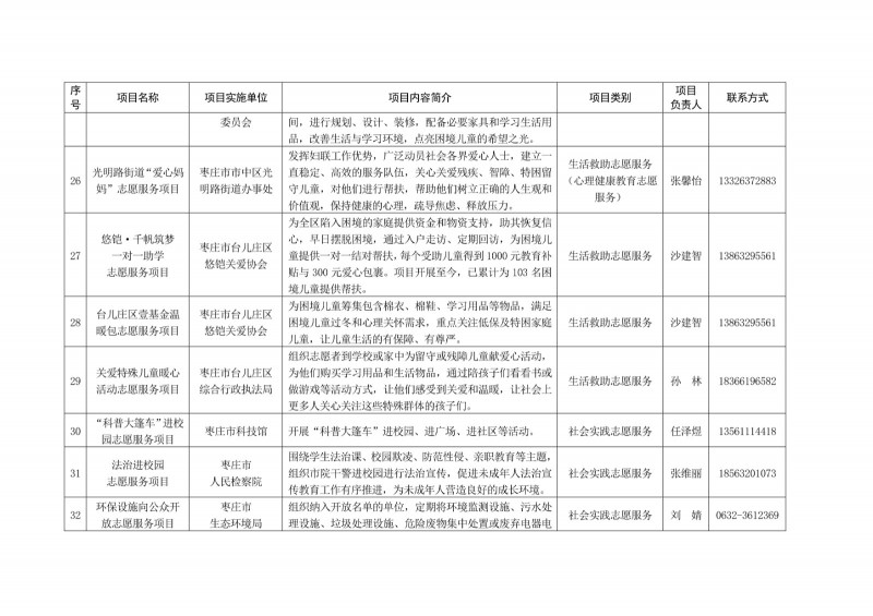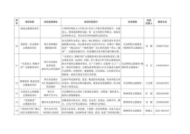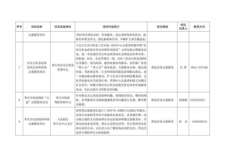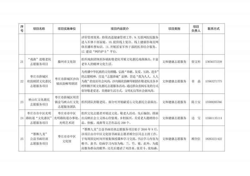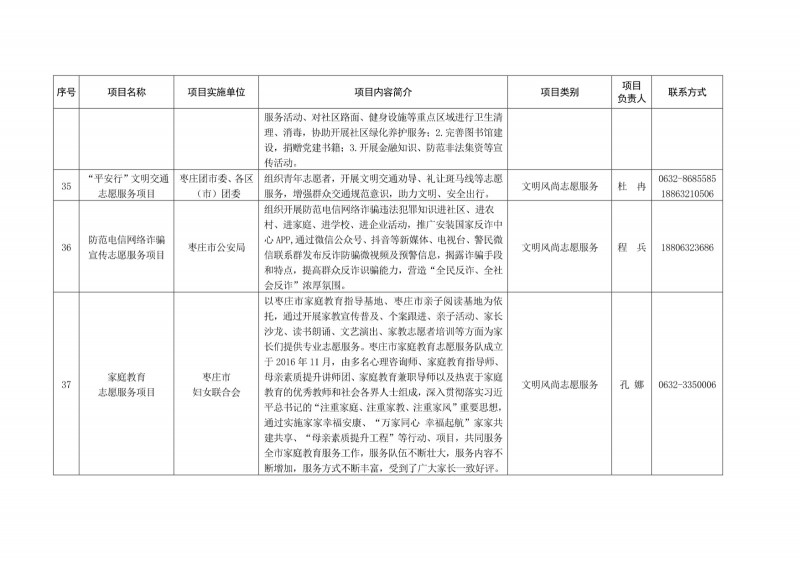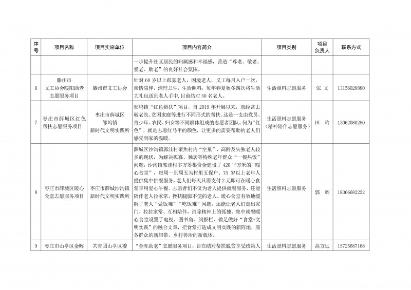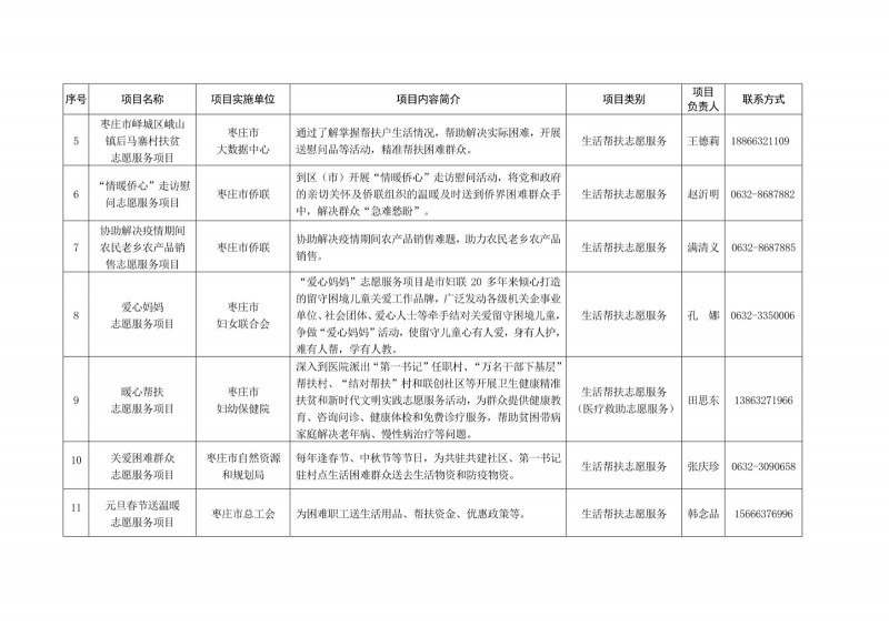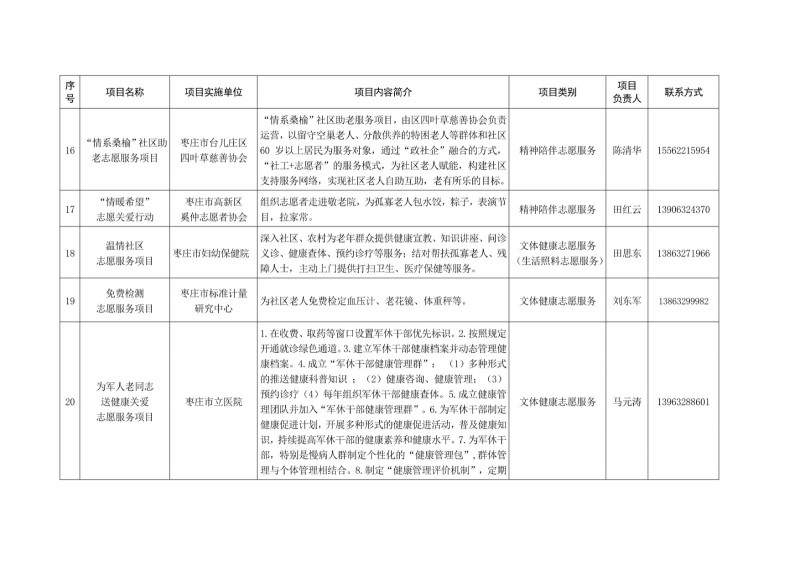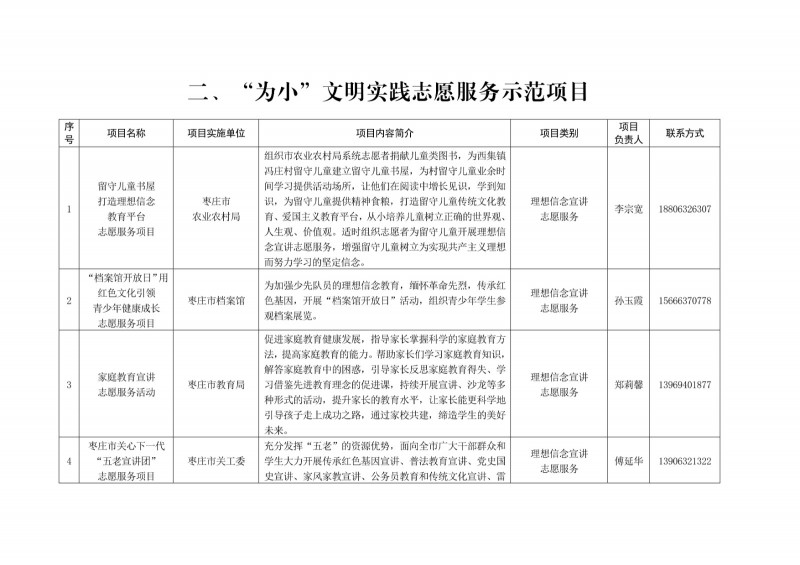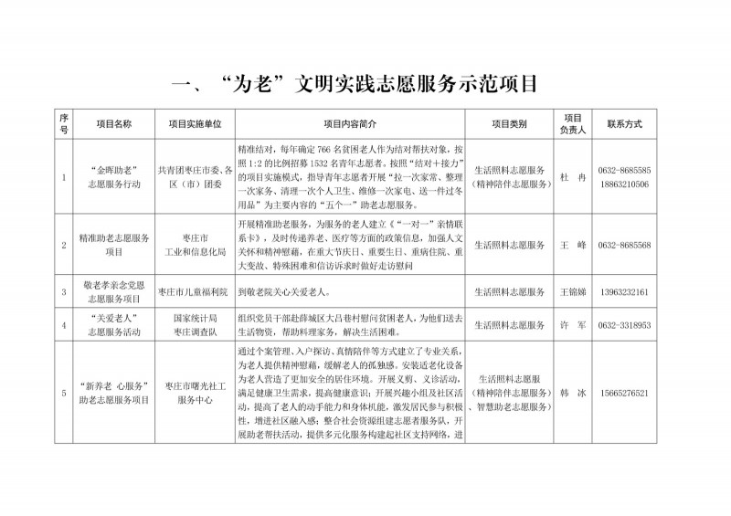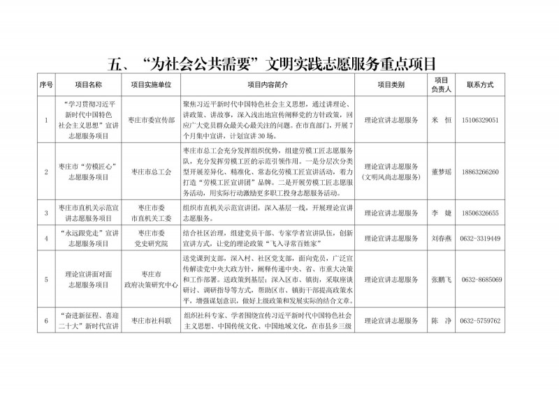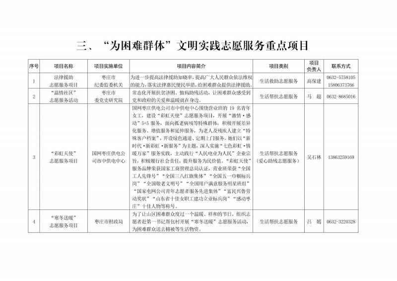 為進一步深化“五為”文明實踐志愿服務,推動文明實踐志愿服務有效供給、精準服務,棗莊市文明辦面向全市廣泛征集志愿服務項目,現挑選主題突出、特色鮮明、運行良好的200個重點志愿服務項目,向社會公開發布,有需求的群體和個人可與相應項目負責人聯系,各項目實施單位將積極為大家提供服務,歡迎廣大志愿者踴躍參與“五為”文明實踐志愿服務活動,共同樹立文明棗莊新風尚。