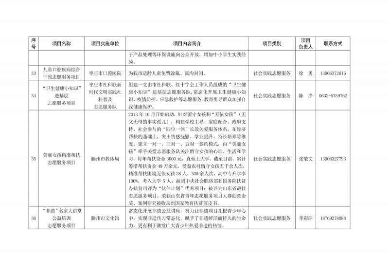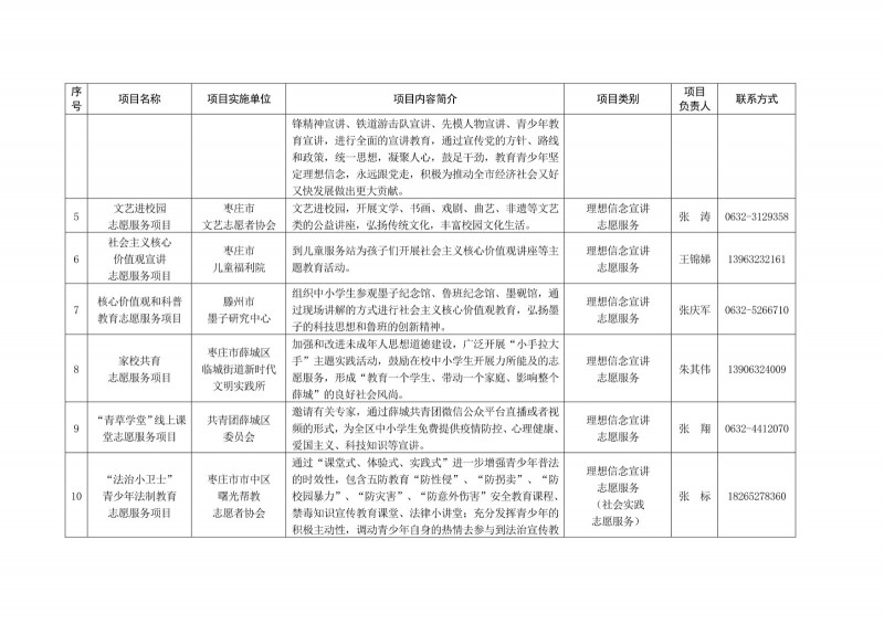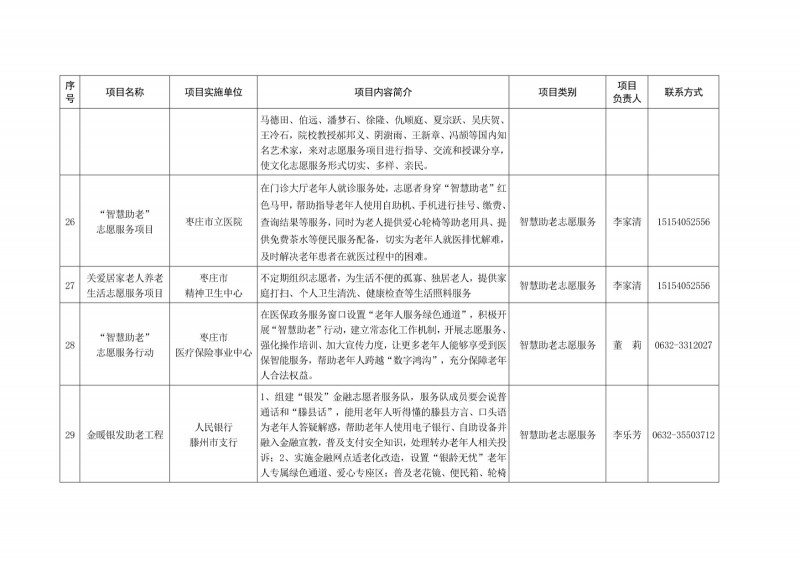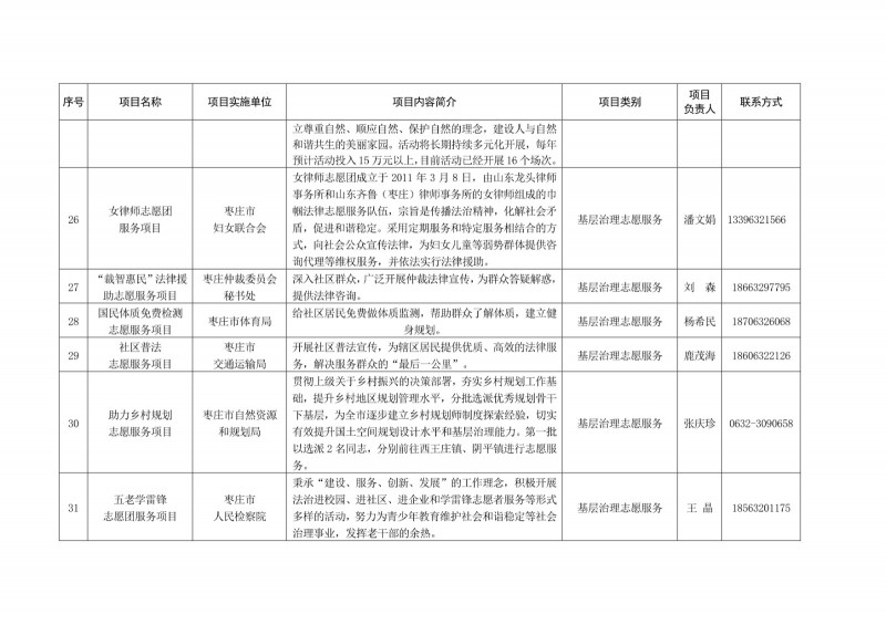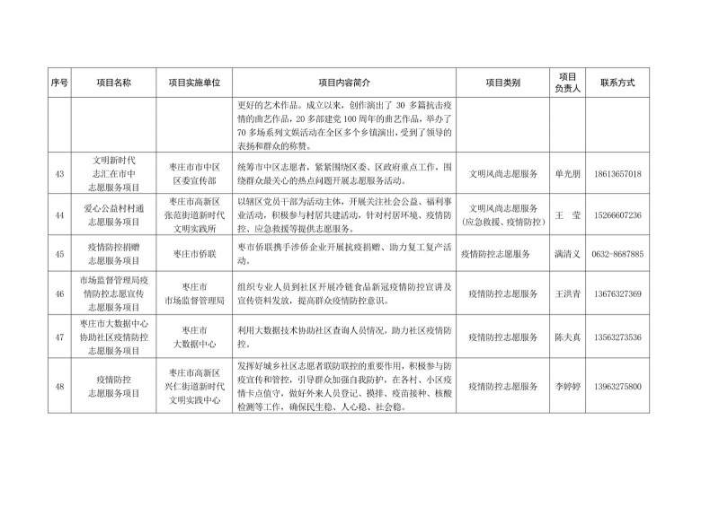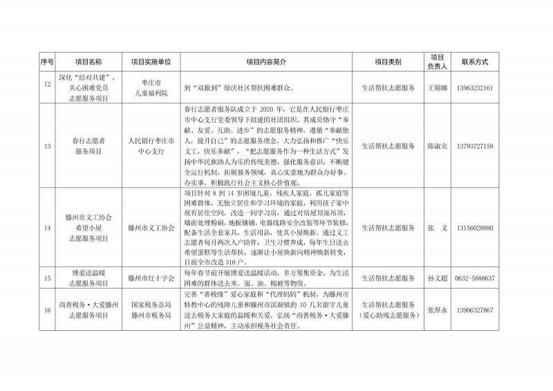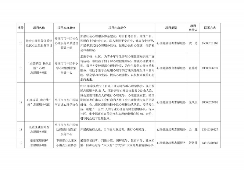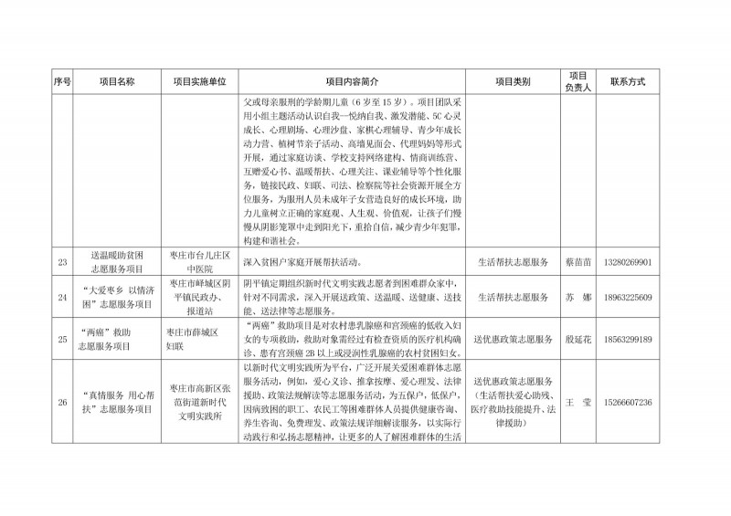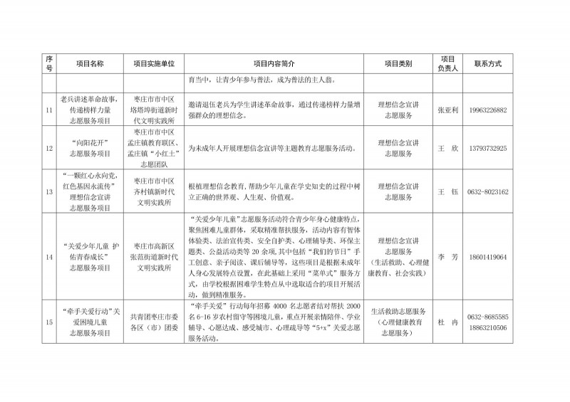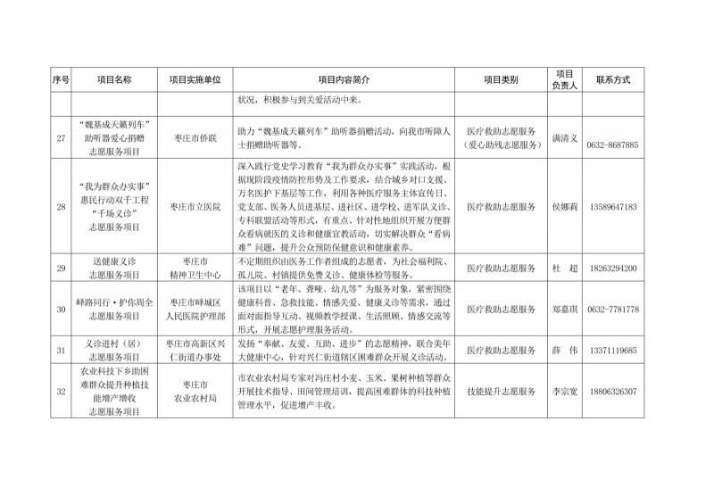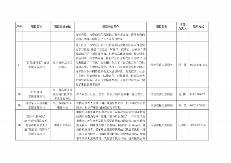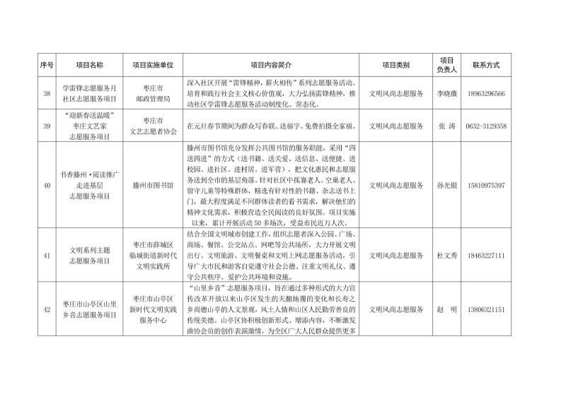 為進一步深化“五為”文明實踐志愿服務,推動文明實踐志愿服務有效供給、精準服務,棗莊市文明辦面向全市廣泛征集志愿服務項目,現挑選主題突出、特色鮮明、運行良好的200個重點志愿服務項目,向社會公開發布,有需求的群體和個人可與相應項目負責人聯系,各項目實施單位將積極為大家提供服務,歡迎廣大志愿者踴躍參與“五為”文明實踐志愿服務活動,共同樹立文明棗莊新風尚。